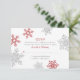 You can easily personalise the text on this simple silver grey, red, and white snowflakes winter wedding RSVP reply card. To change the text, use the personalise options. Or, for more extensive text changes, including changes to the font, font colour, font size, and/or text placement, use the customise it option. Change the text and use this for a reception, direction, accommodation, and/or wedding website insert card. The design has a very modern feel with bold shapes and elegant colours.