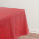 Pretty and simple Christmas holiday tablecloth, great for using all winter, features red snowflakes on a cranberry red background.