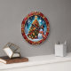 This highly decorative clock features a jolly snowman wearing a top hat and striped scarf, standing next to a magnificent Christmas tree adorned with a wide, flowing red ribbon and gold baubles. The festive winter scene, complete with a full moon and snowflakes, is framed by an ornate red and gold clock border. The design may look real due to the high detail and three-dimensional texture in the artwork.