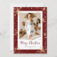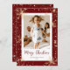 Custom red sparkly Christmas cards featuring snowflakes, stars and snowfall on a red background. Easily personalise these red photo Christmas cards with your image, text, and family name.