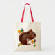 This tote bag features an adorable red squirrel having a snack amidst autumn foliage in fall colours of red, orange and green.