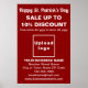 Red poster for St. Patrick's Day that you can customise by specifying the discount percentage, sale dates, uploading your business logo, typing your business name, address, phone number, email and website. Customise it and display it to attract more customers to buy your products or clients to like your services. Please check the appearance after uploading logo and typing texts. If the appearance is pleasing to you, you can place your order now. If you need to resize and reposition the logo and texts to fit on this poster or on the size and style that you've chosen, please adjust in the design tool. You can also change the background colour, font colour and font style in the design tool. Happy St. Patrick's Day! Wishing you the best of luck, joy and more sales this holiday.