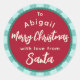 A Christmas postal style sticker for gifts. The design has mint green stripes around the border in turquoise and teal and it says 'From Santa' across the front, with a festive red background. The sticker is designed to look like a postmark or a seal from the North Pole. This would be perfect to label Kids presents, decorate Christmas gifts or to seal the envelopes on a Christmas card.
