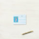 Sticky notes with a nautical theme. Designed with a blue striped pattern and a blue frame with a yellow border layered over top. A red striped lighthouse and a beach ball,  and a  smiling sun and flying seagull off in the distance positioned inside the frame.
