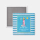 A custom thank you magnet with a nautical theme. Designed with a blue striped pattern and a blue frame with a yellow border layered over top. A red striped lighthouse and a beach ball, and a smiling sun and flying seagull off in the distance positioned inside the frame.