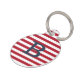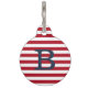 Two side Dog ID Tag with white background on the front with red stripes and a monogram. Back side hold dog name and owners phone number