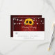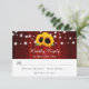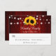 Red and sunflower wedding RSVP card featuring sunflower flowers and string lights on a red barn wood background. Matching items available.