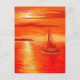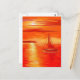 Oil painting of a couple sailing along on a sail boat against a red hot sunset. Image available on various gifts and products. Postcards.