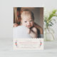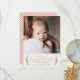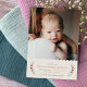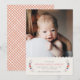 Announce the arrival of your beautiful baby girl with this simple and sweet birth announcement. The name of your baby, as well as the birth information, is framed by a wreath of delicate flowers and leaves. The top of the design features a pretty scalloped border. There is also space for a large photo of your new addition. The back of the card features a red, hand-drawn gingham pattern... Be sure to check out the coordinating self-addressed envelope.
