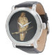 This wrist watch features a female Red Tailed Hawk (Buteo jamaicensis). One of the most widespread and commonly observed birds of prey in North America, this fierce hunter is perched on a branch high up in some evergreen spruce trees, patiently waiting for a meal to appear. Her head is brown and the creamy white breast has brown spots.
