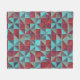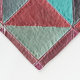 A vibrant geometric quilt of red, teal, purple, and gray triangles—bold symmetry meets tactile artistry