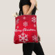 Red textured design with white and off white snowflakes Christmas all over print tote bag. The design features a red texture background with snowflakes and the text "Merry Christmas".