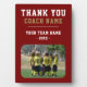 Red Thank you Coach Team Name Photo plaque. Personalise with your coach name, team name, team photo and year. You can change any text on the plaque. A great gift and a keepsake plaque for a soccer coach! Get the team to sign the non-designed areas with a fine point permanent marker.