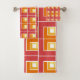 This towel set has a geometric design of L's in red, orange, and yellow, placed in different directions on a field of white.