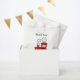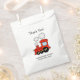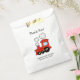 Cute red toy train baby shower party favour bags for new baby boy. Personalised party supplies for babyshower, birth or pregnancy. Add your own name of child / newborn and thank you for coming message. Sympathetic whymsical typography template. Custom colour background. Hand out selfmade sweets, homemade pastry food, fudge candy, cupcakes, baked cakes, doughnuts and other fingerfood for guests. Fun railroad locomotive illustration for kids.