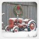 A bright red farm tractor in a blanket of snow, perfectly paired with a festive Christmas wreath on a charming rustic wooden barn, captures the essence of holiday cheer and the beauty of winter