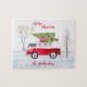 Red Truck Merry Christmas jigsaw puzzle. Personalise by adding your family name and changing the Merry Christmas phrase. Matching Items Available.