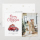 Custom photo Merry Christmas card featuring an elegant script font and a retro red truck on the front and snowflakes at the back. Easily personalise this watercolor holiday card with your photo and text.
