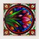 Colourful stained glass artwork showcasing a vivid red tulip surrounded by ornamental floral embellishments, creating a classic and artistic aesthetic with bright hues and intricate design details.