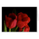This gorgeous note card features a bouquet of scarlet red tulips and green leaves set on a pure black background.