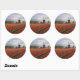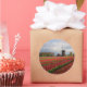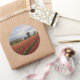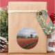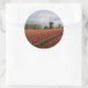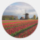 Round photo sticker of a spring landscape with a field with red tulips and other flowers and a windmill during sunrise in the Keukenhof gardens, Bulb Region, the Netherlands.