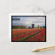 Postcard of a spring landscape with a field with red tulips and other flowers and a windmill during sunrise in the Keukenhof gardens, Bulb Region, the Netherlands with a black edge and the text 'Netherlands'.