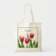 Red tulips with greenery flowering within a green rounded corner square border tote bag with name.