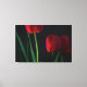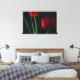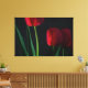 Wrapped canvas art is shown with a photo print of beautiful red tulips with water droplets.