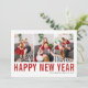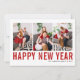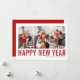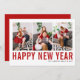 Happy New Year! Customisable Happy New Year photo collage flat card featuring red simple typography and snow pattern. Personalise by adding three photos, names, year and other details. This modern New Year flat card is available in other colours and cardstock.