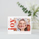 This is a bright and simple red and white holiday postcard featuring a minimalist single photo combined with “joy” in a bold and elegantly classic serif font.
