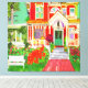 Mixed media drawing and digital of vintage red Victorian house in lush yard setting with flowers, bushes and tree.