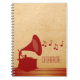 Quirky and unique Vintage Gramophone Notebook in dark red featuring a silhouette of an old-fashioned gramophone and a cascade of musical notes on a digital art rendered paper background. This chic custom notebook will keep your notes and thoughts together with vintage flair and is perfect for any music lover. Easy to customise, simply personalise with the text of your choosing. Click on the "Customise It" button to find additional personalisation options.