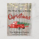 A vintage red pick up truck is carrying a freshly cut Christmas tree. Card background is rustic barnwood and a string of vintage string lights hangs overhead.