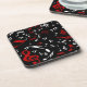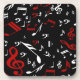 A cool, modern and eye-catching musical design featuring a random jumbled pattern of musical notes and treble clefs in red and white on a classical black background.