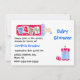Cute baby shower invitation, with a whimsical baby bottle, at the top, with graphic text reading BABY. A sweet little boy's striped overalls and pair of tiny red tennis shoes decorate the bottom right of the invitation. Text is fully customisable to suit your needs.
