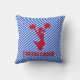 Fun cheerleader's throw pillow done in a blue and white diagonal stripe pattern, on the front and back. Graphics of an red silhouette of a jumping cheerleader decorates the front, with red bold text reading CHEERLEADER. Red text, on the back has a name that is ready to personalise for yourself or as a great gift to any age cheerleader.