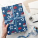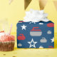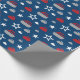 Wrapping paper featuring a stars and curling rocks pattern in red, white and grey on blue background. Perfect for curlers and curling fans.