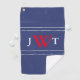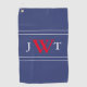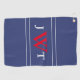 Looking for a personalised father's day gift? This patriotic golf towel has a red monogram on a blue background. There's a large red letter in the middle and a white initial on either side of it.