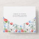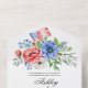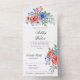 This patriotic red, white and blue floral design is perfect for a summertime, Fourth of July wedding. The top flap features a red white and blue floral bouquet accented by an American flag. The back side of the card has a coordinating floral background.