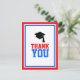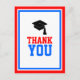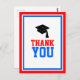 Say Thank You with this Red, White and Blue Graduation Party Thank You Postcard. It features 'Thank You' in red and blue respectively and a black grad cap surrounded by a blue, red and white border. The back is blank for your personal message.