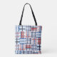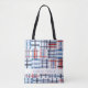 This tote bag features a patriotic - red, white and blue - madras pattern. There is a customisable area to add your own text such as family name or beach house name as well as a location.