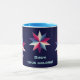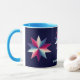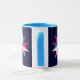 This lively patriotic mug sports three simple pinwheel patterns of red, white and blue in the shape of a star. The text reads: Show your colours! It can be customised or removed.
