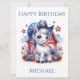 A cute patriotic design with a white pony wearing a red and blue cowboy hat on a farm with a red barn. Perfect for summer birthdays. Personalise the card with your child's name.