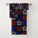 This patriotic design features a pattern of red, white, and blue stars on a black background.