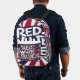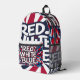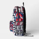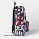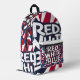A vibrant and energetic design featuring a playful geometric pattern with the colours of the American flag. The flag's red, white, and blue stripes are artfully arranged into abstract shapes, creating a dynamic and eye-catching visual. Overlaying this pattern is the phrase "Red, White, and Blue," written in fun, whimsical lettering that complements the overall design. The typography is bold and exudes a sense of joy and patriotism.