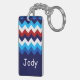 A monogrammed acrylic rectangular keychain featuring a colourful, trendy pattern design of red, white, and blue chevrons. Create the perfect customised gift by clicking the “personalised” button to add a name or custom message in the provided template field. Select the “click to customise further” link to change the font, text size and more.