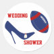 Fun football themed invitation envelope seal stickers. Done in a round shape, with a white background and graphics of a red and blue football being kicked with a elegant blue stiletto high heel shoe. Red text reads Wedding Shower. Personalise the text for your event.