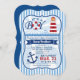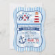 It's a boy! Cute, lighthouse, anchor and lifesaver nautical theme boy baby shower invitation on blue and white stripes pattern. Features red and white lighthouse on wavy ocean water, red and white lifesaver, and blue boat anchor. Colours include red, navy, royal blue, white and sky blue. Vintage bracket shaped invite.