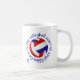 This sporty volleyball team colours coffee mug with monogram features the typographic phrase, "The volleyball court is my happy place" and two heart outlines in red encircling a volleyball with red, white and blue coloured panels - customise with monogram - by katz_d_zynes