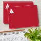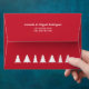 Custom red holiday card envelope features a geometric white Christmas tree with a custom monogram inside it on the top left of the front. The back flap has a customisable printed return address. On the back there is also a row of 7 white trees which goes across the bottom. Add your monogram initial, name and address in the sidebar. A modern geometric pattern of red Christmas trees on white is printed inside the envelope.